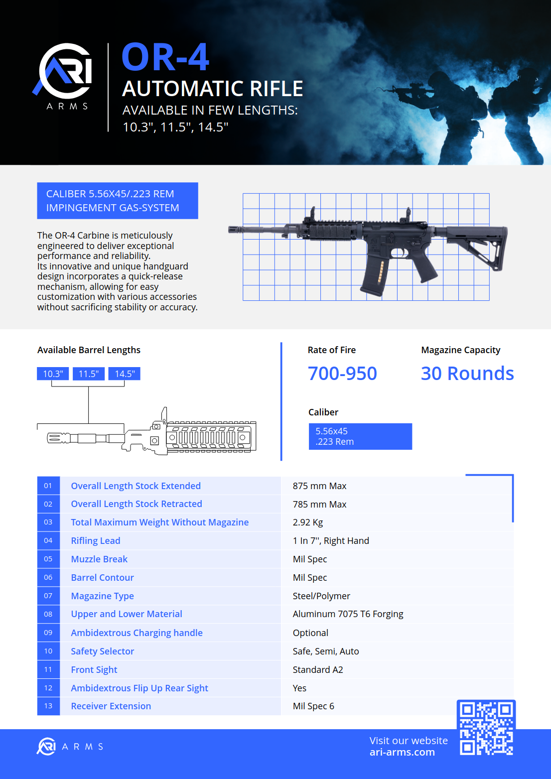 The ARI Arms OR-4 features a modified direct impingement system with improved gas regulation. The rifle maintains the familiar AR-15 manual of arms while reducing fouling and improving reliability in adverse conditions. Barrel life is reportedly 50% longer than standard M4 carbines.